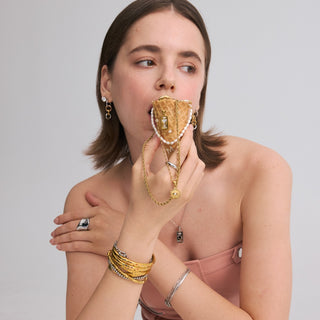 The Aura Earrings are bold without the weight — an abstract, open-form hoop designed to bring soft structure to your look. Their curved silhouette and high-shine finish reflect light like liquid gold, making them a go-to for standout style, day or night.